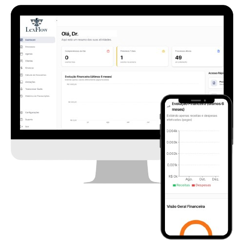 A plataforma centraliza, em um único ambiente, a gestão de processos, clientes, prazos, documentos, tarefas, agenda jurídica e equipe (LexTeam) — tudo acessível pelo celular ou computador, em tempo real. Com o LexFlow, você elimina o improviso, padroniza sua organização, automatiza lembretes, controla responsabilidades individuais e passa a tomar decisões estratégicas com base em dados concretos.